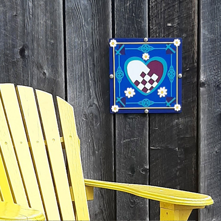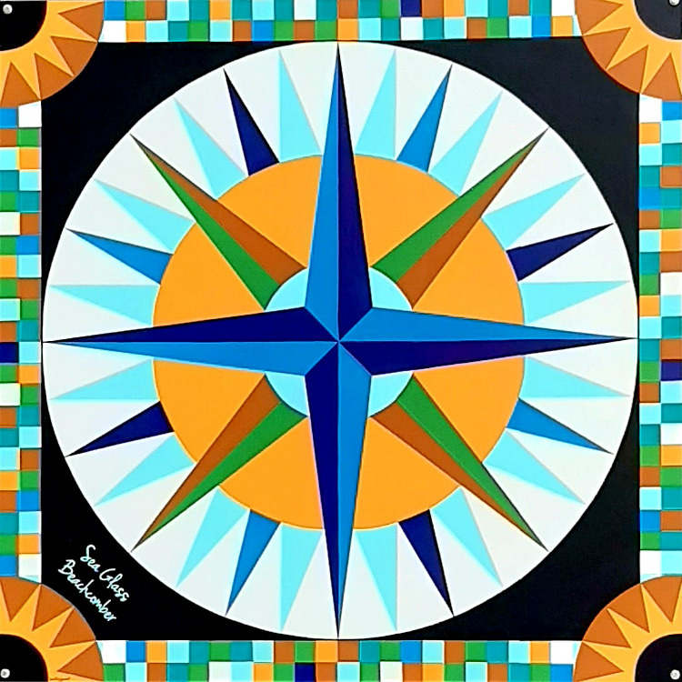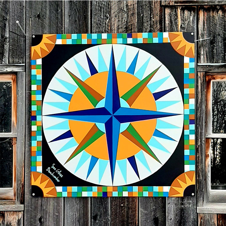 ‘Sea Glass Beachcomber’ is a recently painted 48″ Barn Quilt. It was inspired by the colors of glass found on Melville Beach, Nova Scotia. Thank you for the jar of beautiful beach glass Sandy Murray!