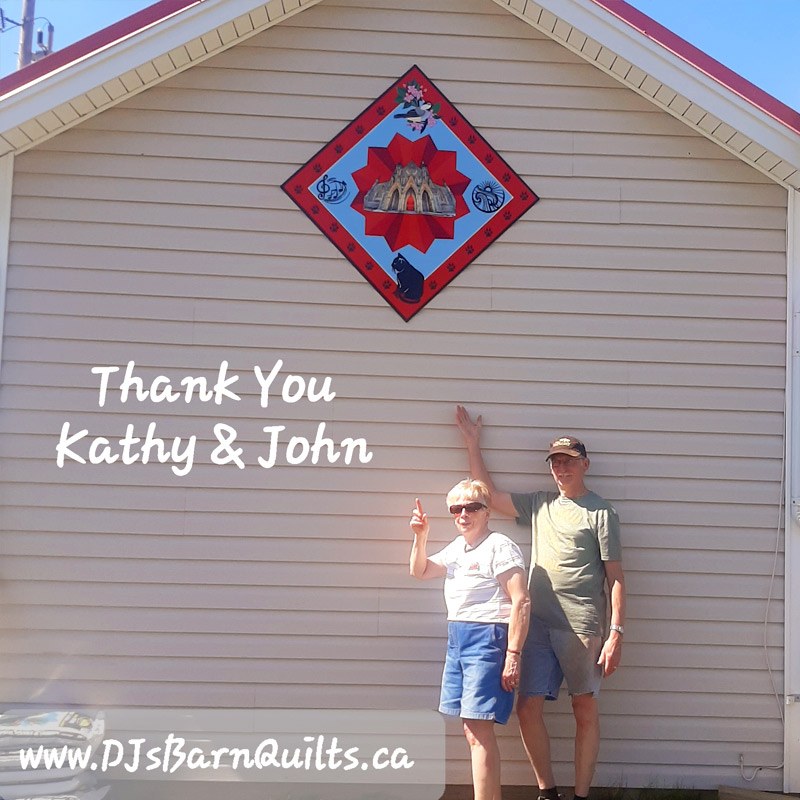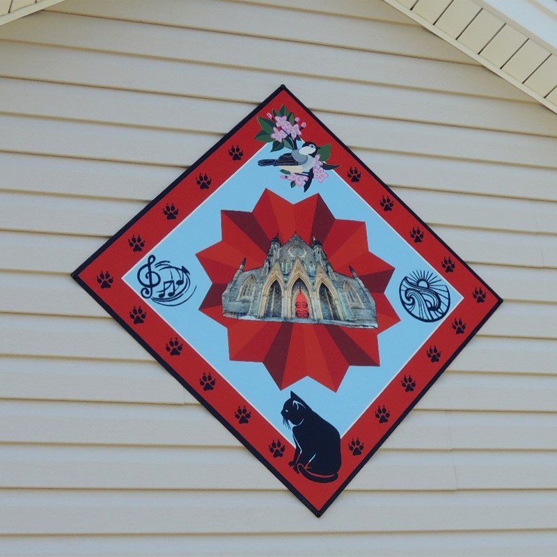 Thank you Kathy & John of Marshville, Nova Scotia. Their custom barn quilt is a hybrid that includes a bit of sign work and many hours of hand-painting to capture their life story on an outdoor art piece. It was fun to work with Kathy as she generously shared their serendipitous life journey. Certainly not all of their milestones are included on the barn quilt, but the centerpiece is Christ Church Cathedral in Montreal where they met and three children were christened. Their adventures eventually brought them to Nova Scotia where they settled in beautiful Marshville. Kathy and John are dedicated swimmers and the ocean they overlook always beckons. Throughout the busy years, they maintained their musical interests and there has always been a cat (or two) to approve of all the ‘goings on’.